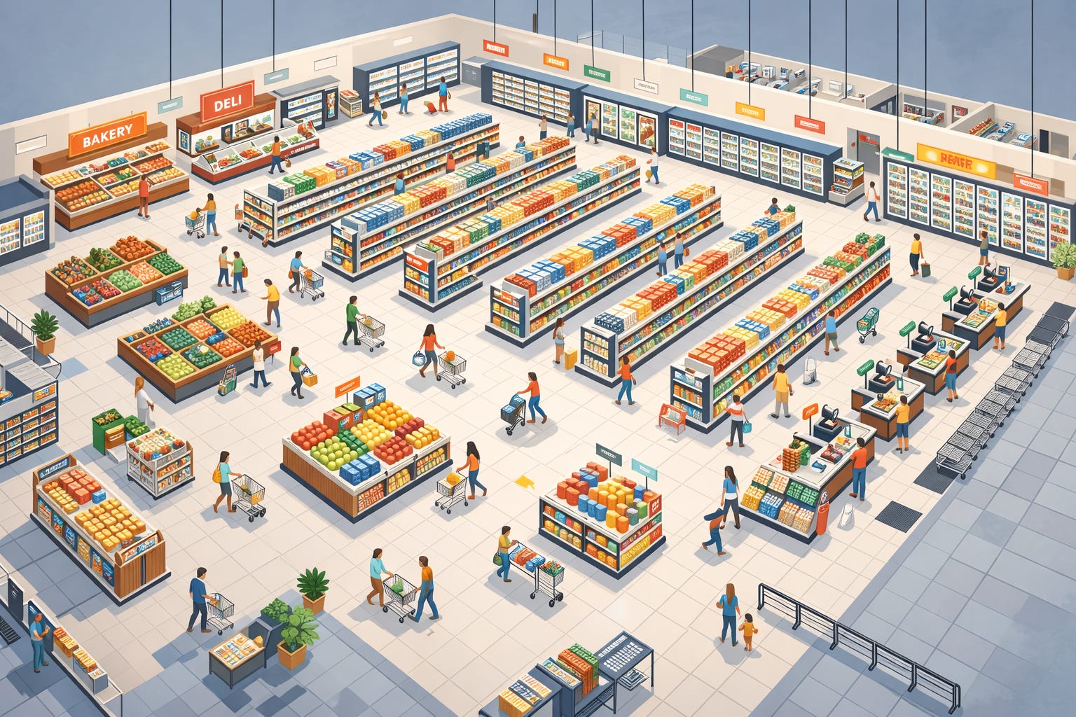 The supermarket is extremely busy. Despite CASHIERS and BAGGERS staffing almost every lane, each checkout line is at least three SHOPPERS long.